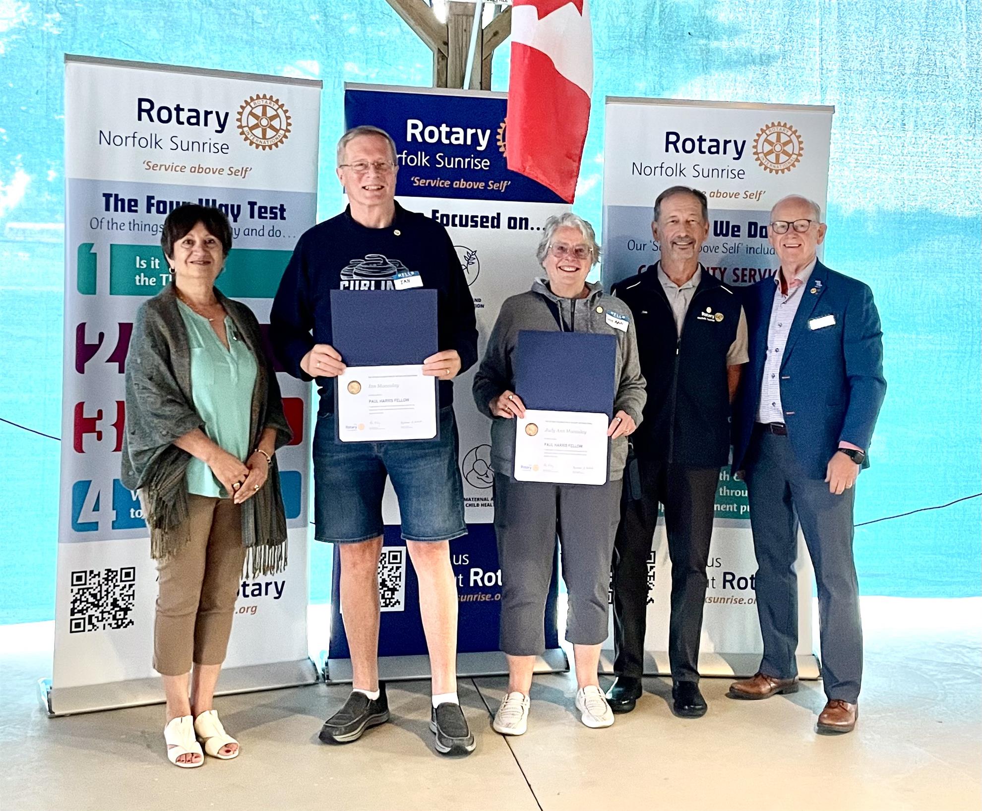 One of the three ways that a Paul Harris Fellowship may be awarded is for the parent club to use its Foundation contribution points to nominate a particular member of its own club or the community at large. On 26 August 2025, at our Welcome Back BBQ, the RCNS took the opportunity to recognize a truly wonderful family team within our Norfolk community, two selfless people who have distinguished themselves in exactly the light that Paul Harris had envisaged.