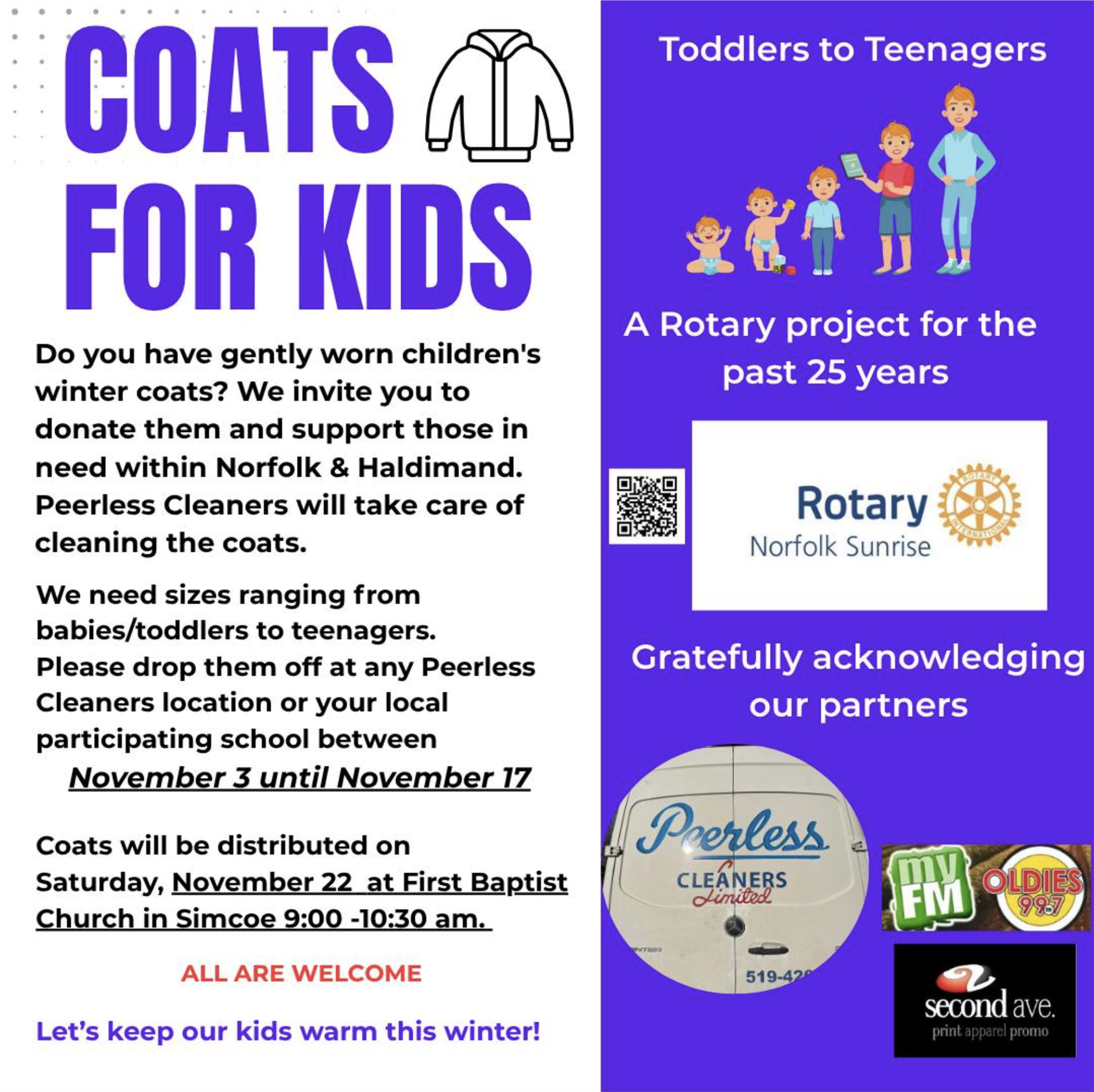 So, once again, the Rotary Club of Norfolk Sunrise, in collaboration with Peerless Cleaners, the Langton Knitters and the First Baptist Church have organized our ongoing Coats for Kids community support event. With the support of many players and the involvement of local church and school groups, we collected almost over 800 coats. Our friends at the Langton Knitters donated a huge variety of knitted products for kids and infants. Russ and Elisa Wilson, owners of Peerless Cleaners ensured that all of the products were cleaned and hygienically prepared for give-away.