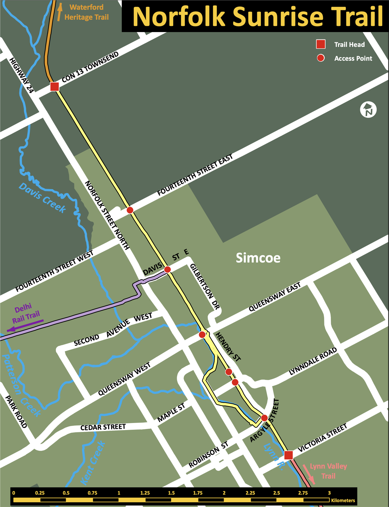 The Norfolk Sunrise Trail runs from Argyle Street in downtown Simcoe to Concession 13 north of town, connecting the Lynn Valley Trail, the Waterford Heritage Trail, and the Delhi Rail Trail. It is heavily used by local walkers and cyclists, and as part of the Trans-Canada Trail brings cyclists into Norfolk County from other communities.