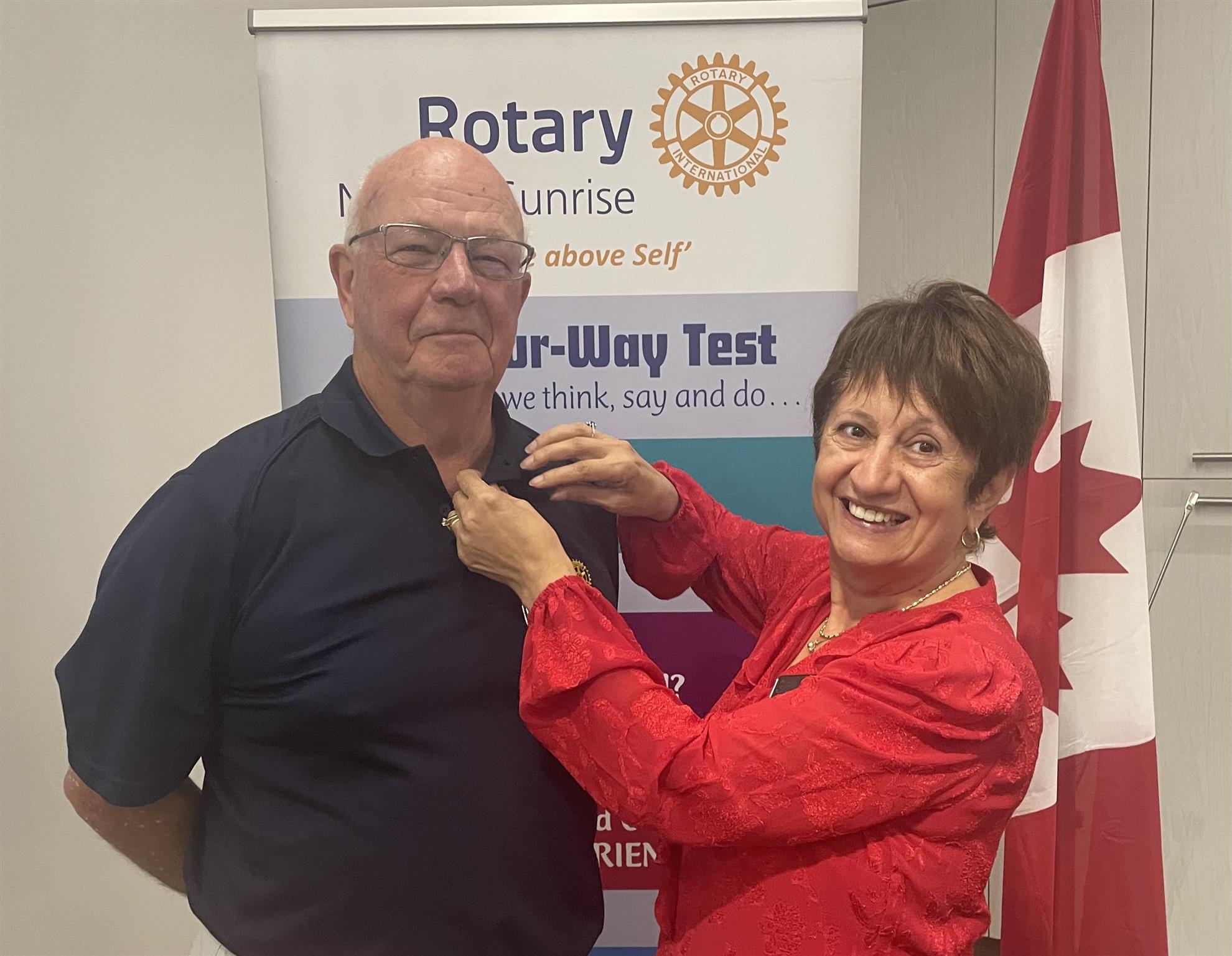 "Last Tuesday morning when District Governor Aaron Carlson was with us, Aaron came prepared to make a very special presentation to honour one of our club members, and I was going to assist Aaron. But that member wasn’t here last week. So this morning Mary and I are delighted to recognize an extraordinary individual who embodies the spirit of Rotary—'Service Above Self,' and present this club member with the prestigious Paul Harris Fellow recognition."