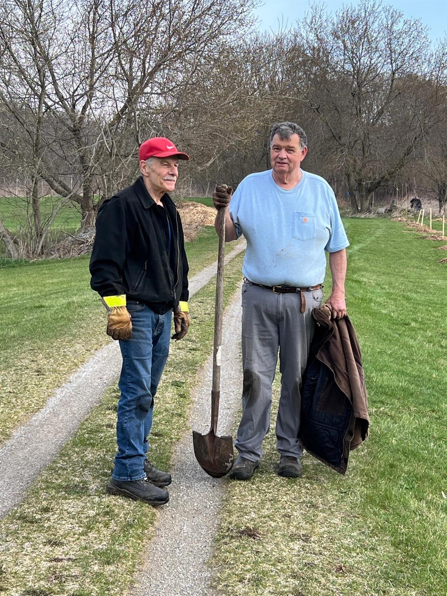 The trail is currently owned by the provincial Government however the future plan is to transition this parcel to the Waterford Heritage Trail Association and to Norfolk County. Adam Biddle from Norfolk County approved the tree species selection and offered to space the trees and mark each location. His expertise and knowledge was greatly appreciated.. It was important to have the blessing of the county in order not to create present or future problems. Support of the neighbour was also needed so as not to shade his solar panels near the trail. This naturally determines the tree species selected when considering the height of the trees when mature. in order not to shade the panels.